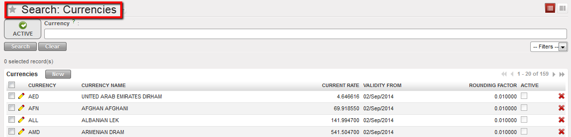 Currencies List displayed in the Currencies Search view