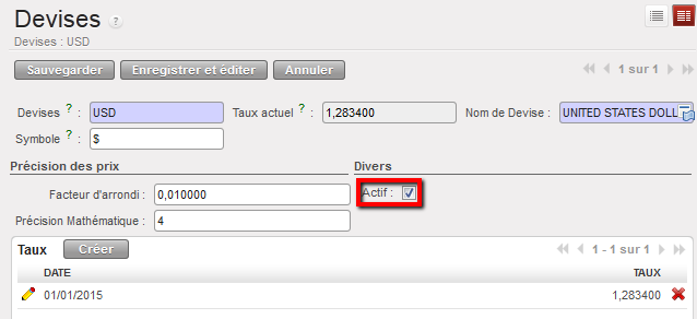 de la devise pour modifier la fiche. - Cochez la case {Actif} et sauvegardez. Dans l’exemple ci-dessus, nous activons le USD.