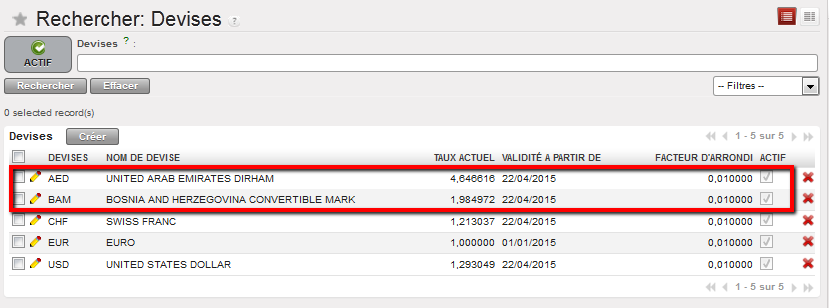 - Vérifiez que les devises ont été activées dans l’écran de recherche des devises en choisissant le filtre Actif.