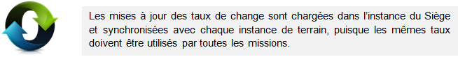 Les taux de change sont généralement définis mensuellement, ce qui peut générer des gains ou des pertes de change selon un calcul automatique lorsque deux écritures comptabilisées au cours de différentes périodes sont lettrées ensembles (p. ex. des avances déboursées en mai 2014 et remboursées en juin 2014). Cet ajustement automatique se fonde sur la date de comptabilisation des écritures concernées.