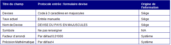Manuel de l’Utilisateur Finance -> 2. Configurations Finance -> 2.3 Gestion Multidevise -> LUFI-20305 Création manuelle de devises
