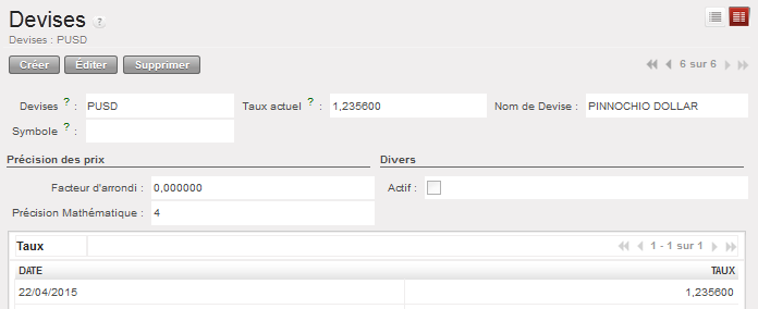 La plupart des devises utilisées par MSF se fondent sur la norme ISO. Toutefois, il peut parfois être nécessaire d’ajouter une devise non standard. Le cas échéant, vous devez demander au Siège de créer la devise en question. Celle-ci sera ensuite synchronisée avec votre instance en mode « Inactif » et vous devrez donc l’activer.