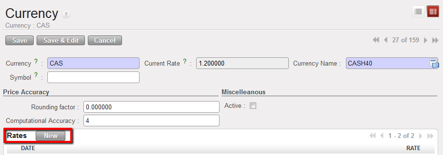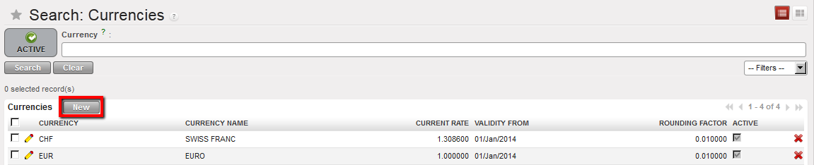 - In the {Currencies} Search view, click on {New} button.