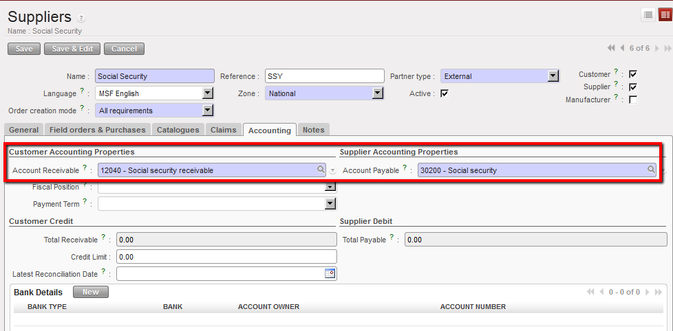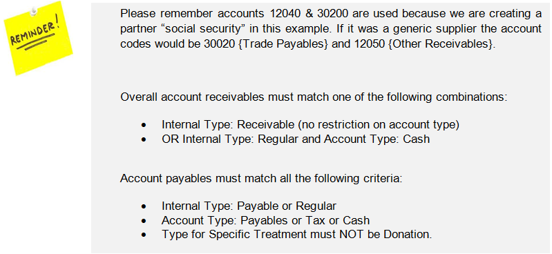 16. In the Accounting tab, enter the Account Receivable 12040 {Social security receivable} and Account Payable 30200 {Social security).