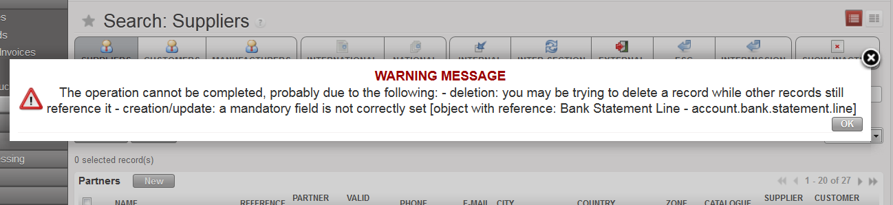 In this example, you cannot delete this partner because there is a transaction booked against it in a bank register.