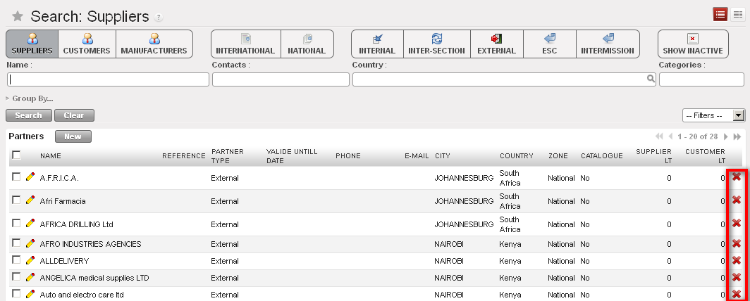 - The partners list appears. You can use the filter buttons or fields to narrow your search to a specific supplier or customer.