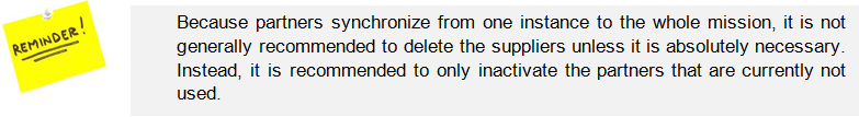 Authorized financial and supply users have the option to delete a partner for example when a partner was created by mistake. However, partners cannot be deleted if they have transactions against them. In such a case, there is a warning message. Also, partners can’t be deleted if they originate from other instances.