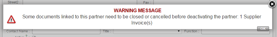 Before inactivating a partner/supplier, you must confirm all documents (invoices, purchase orders, field orders, and vouchers of any kind) associated to this partner are closed. If not you will be prevented from disabling the partner and the following error message will appear:
