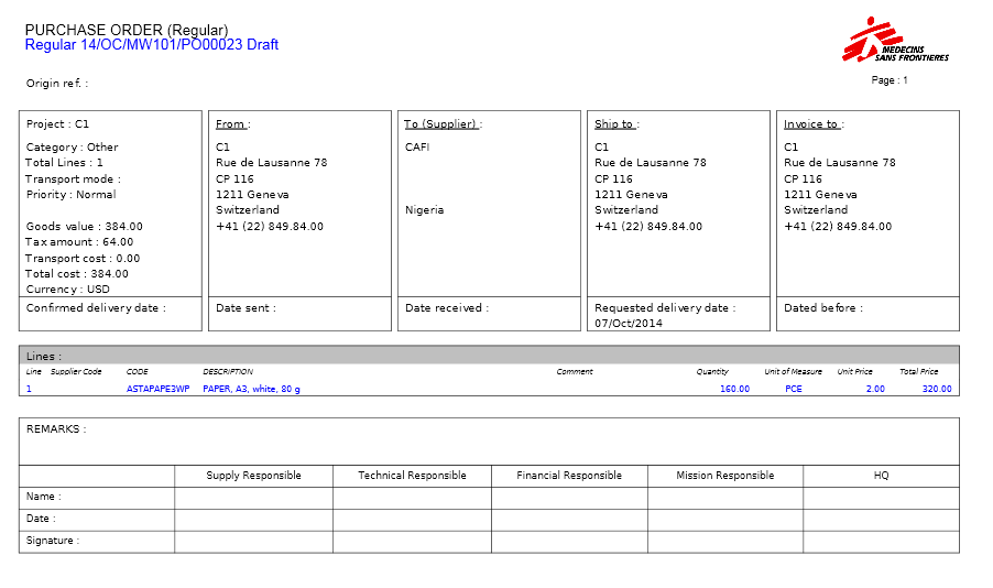 La liste d’achats est un bon de commande standard qui n’a pas été attribué à un fournisseur spécifique, mais à un partenaire {Marché local} générique. Le fournisseur {Marché local} peut être modifié. Cette option est généralement utilisée pour les produits achetés au sein du marché local avec une avance opérationnelle. Elle n’entraîne pas la création d’un bon d’engagement, puisque le délai de l’achat est court et les montants ne sont pas significatifs par rapport au budget total.