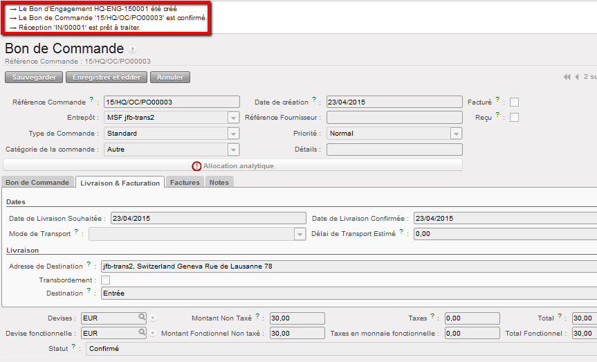 - Un autre PO est émis pour un fournisseur externe (automatiquement lié à la FO) et l’allocation analytique est faite sur le projet.