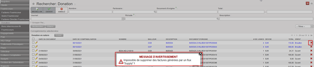• Vous recevrez le message d’avertissement « Impossible de supprimer des factures générées par un flux « Supply » ! ».