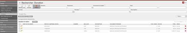 • Les IKD (donations en nature) supprimées ne seront pas supprimés de la vue mais apparaîtront en gris lorsque vous cliquez sur le bouton d’en-tête « Annulé » afin de garantir la traçabilité.