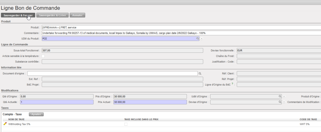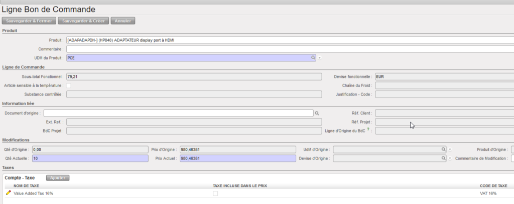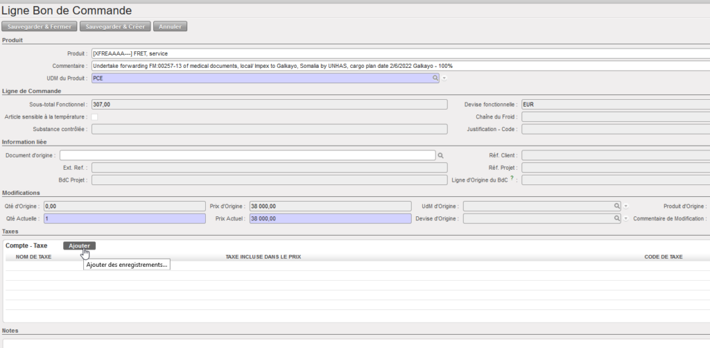 Nous pouvons rajouter une taxe à la ligne dans l’écran de Ligne de bon de commande: