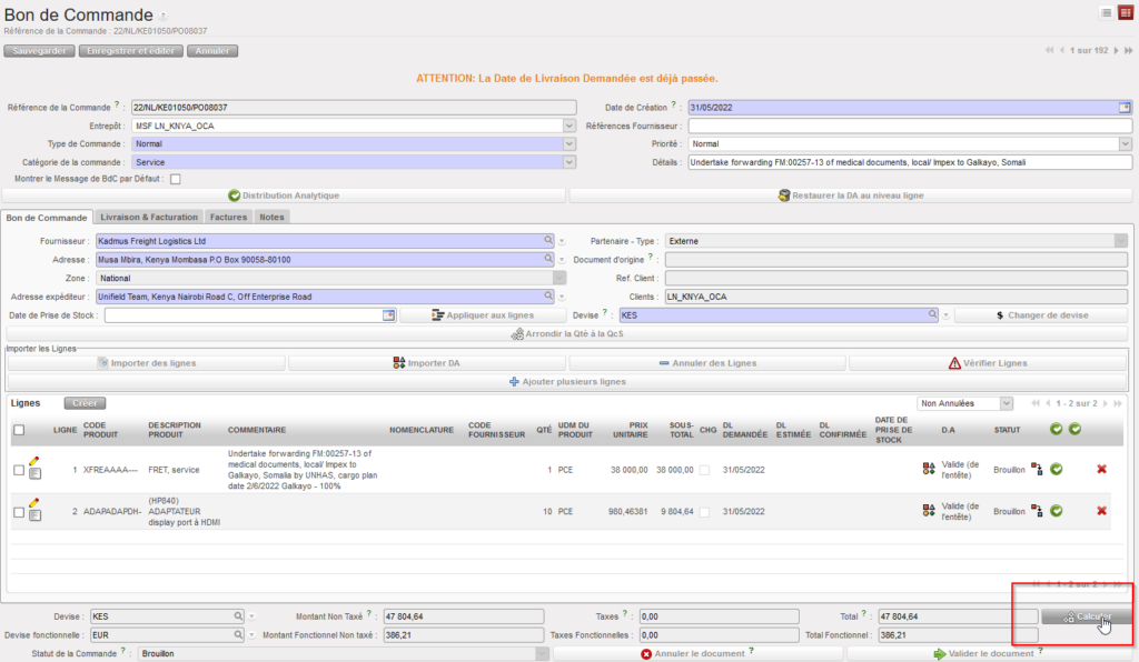 Le PO demeure en mode brouillon jusqu’à ce que l’utilisateur du service Achats clique sur « Valider » : le statut bascule alors en mode « Validé ». Sur la base de procédures spécifiques des OCs, le service Achats a la possibilité d’imprimer le PO afin d’obtenir les autorisations nécessaires pour approuver cet achat.