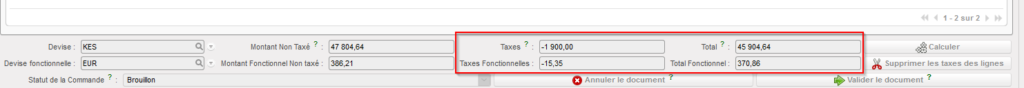 Une fois la taxe rajoutée, nous devons clicker au button Calculer, pour mettre à our les champs du Bon de Commande avex Taxes et Total: