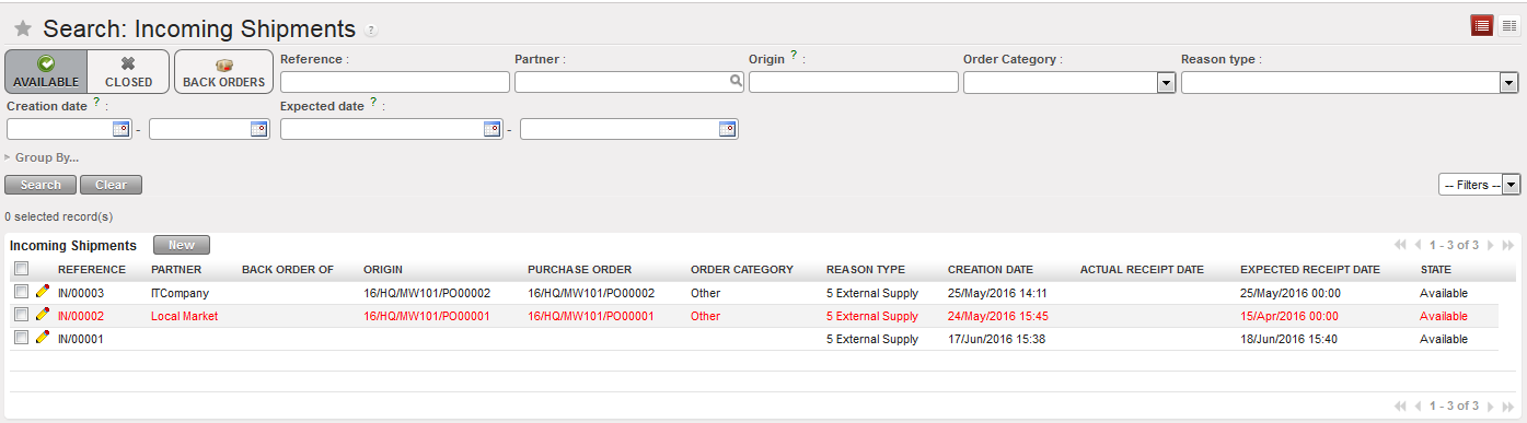 When the goods are received, supply processes the reception in the UniField warehouse sub module. Supply confirms product item and quantity received, and makes changes if needed, e.g. change in product, etc. The supply validates the incoming shipment (it becomes closed) and a draft supplier invoice is created.