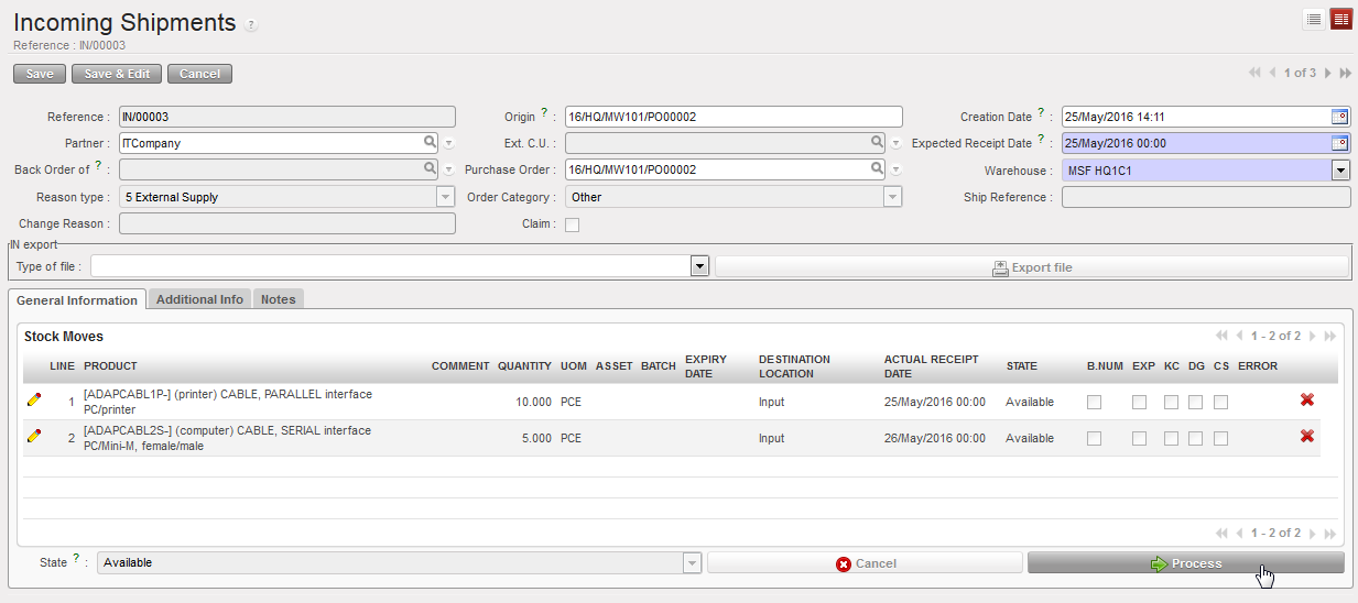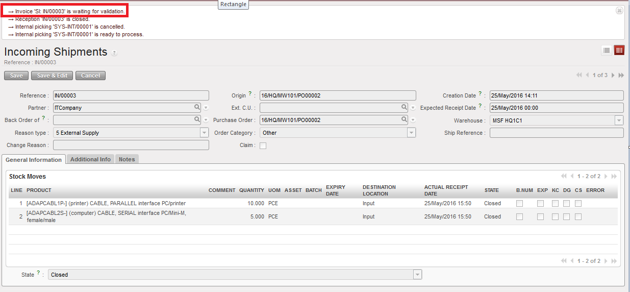 When the goods are received, supply processes the reception in the UniField warehouse sub module. Supply confirms product item and quantity received, and makes changes if needed, e.g. change in product, etc. The supply validates the incoming shipment (it becomes closed) and a draft supplier invoice is created.