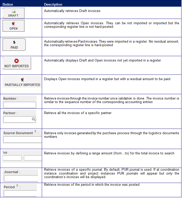 | Total | Manual entry | To be entered right before validating the invoice and should match the calculated total of the invoice lines; this is just a check for the user to confirm the total amount |