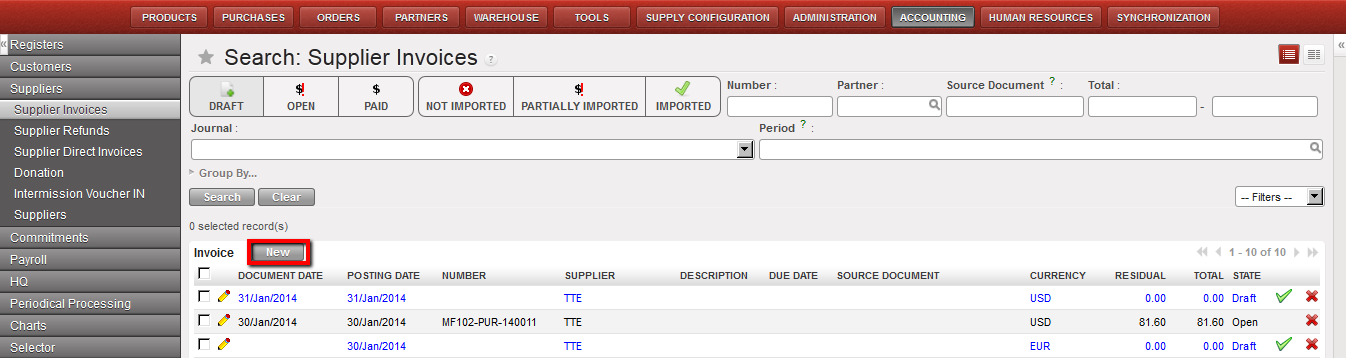 Previously, we explained the automatic creation of supplier invoice through the purchase process initiated by supply. In addition, finance can create a supplier invoice as a stand-alone invoice in the Accounting Suppliers sub-module when finance is paying for goods or services not purchased by supply. Items listed on the manual supplier invoices will not be reflected in the UniField warehouse stock.