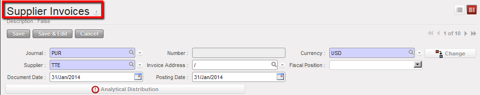 | Currency | System default | The currency is by default selected based on the {Supplier} selected for the invoice |