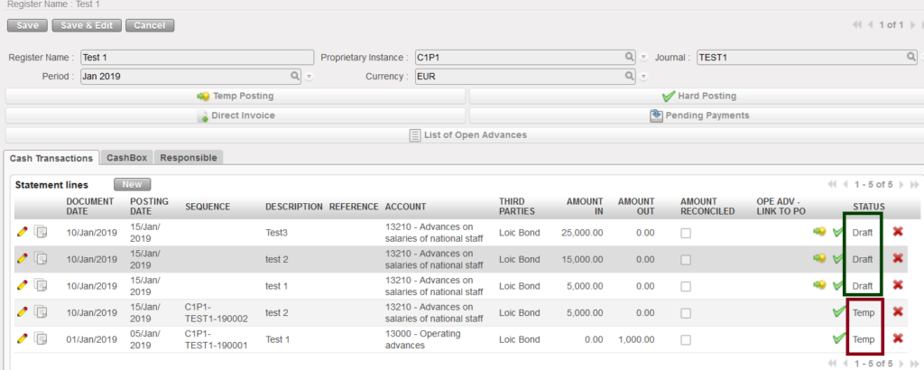 : Entries are created in the register and assigned a sequence number. They are reflected in the corresponding journals and the accounts balances with their counterpart accounts (double-entry bookkeeping). They are editable and can be deleted. Temp posting means that an authorised user is validating an accounting entry. The user can do it individually or by grouping several entries.