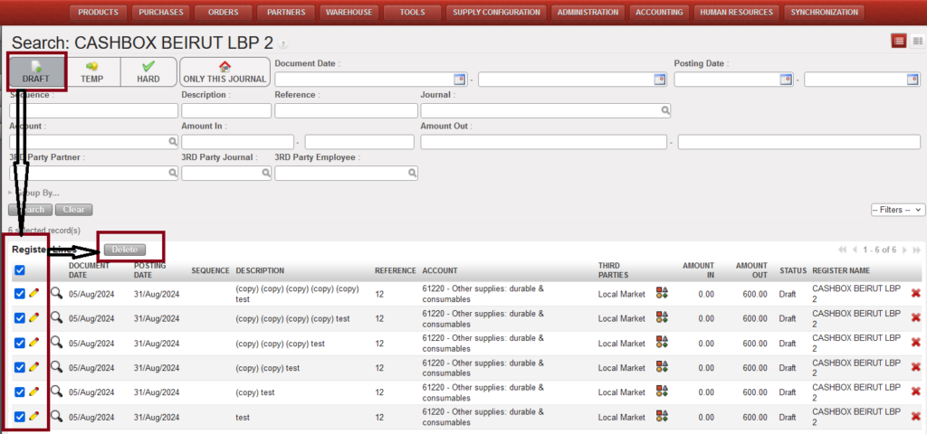 • In the “Search view” toggle on “Draft” button, select all draft lines and click the “Delete” button, all lines will be deleted.