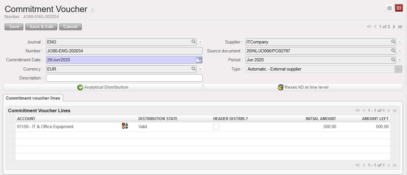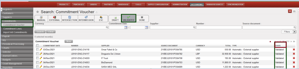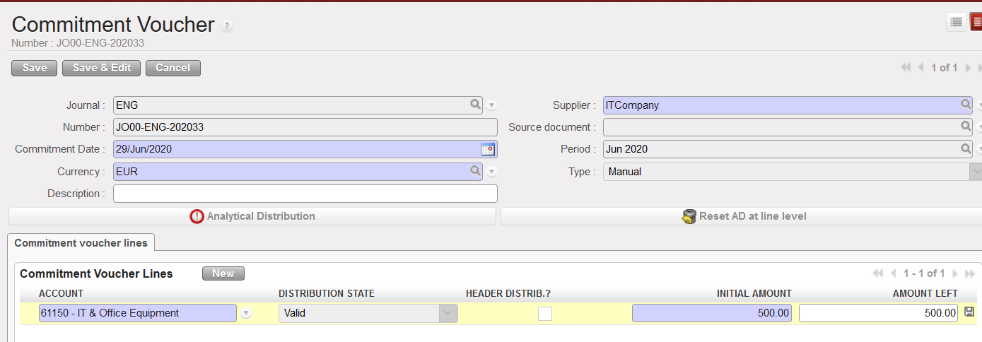 Below we will see how to validate a Commitment Voucher once it was issued via the Supply flow. Then we will explain the creation of a manual commitment voucher in case the purchase did not go through the supply process and you still want to reflect the engagement into your budget.