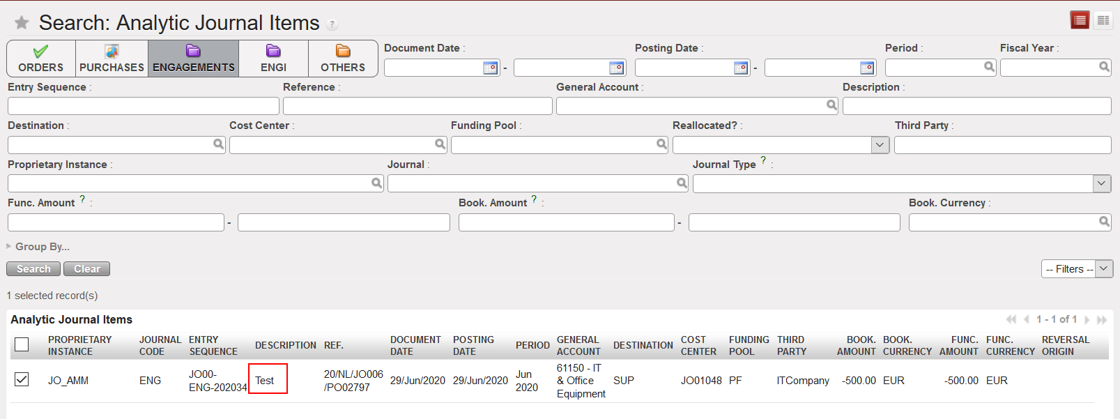 5. You can update the {Description} at the header level of the Commitment Voucher. This field will be empty and editable (even after CV validation). If nothing was written and the field {Description} was left empty, the value per default would be the same as the entry sequence.