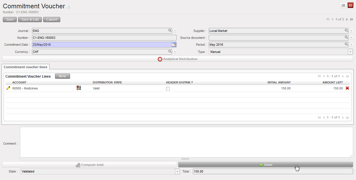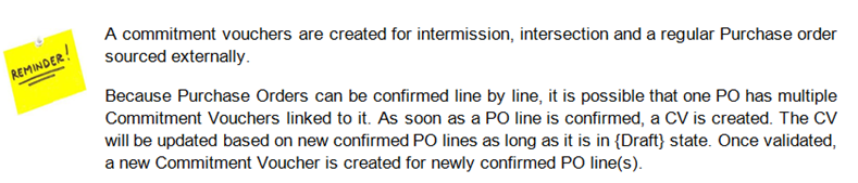 When a regular order is placed to an external supplier , inter-section or intermission, MSF has an engagement (or promise to pay) towards the supplier. The commitment voucher helps us monitor our budgets and cover the gap of time from the moment MSF agrees to buy an item to the moment MSF pays for it (upon reception of the goods). UniField automatically creates a Commitment Voucher (CV) in {Draft} state when a full PO or an individual PO line to an external partner ,inter-section or intermission is confirmed. Once checked and validated by an appropriate finance staff member, this voucher is included in the budget as a commitment to pay and the related extra accounting lines are created in the engagement journal. The commitment voucher is set to {Done} when the supplier invoice,inter-section or intermission are validated by the finance team.
