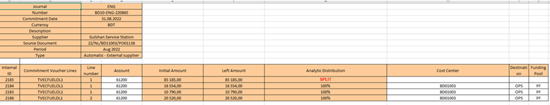 - In the case that a line of the commitment voucher has been split in several lines, the AD will be empty. We will have the word “SPLIT” in the column “Analytic distribution”. The 3 last columns Cost Center, Destination and Funding Pool will be empty.