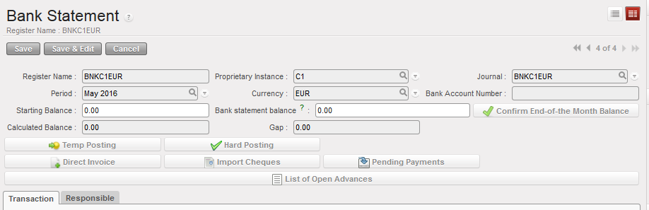 Two (2) tabs are located in the middle of the Bank Register the form. They are called the {Transaction} and the {Responsible}. The {Responsible} tab reflects the list of authorized users to access the register. The {Transaction} tab is used to record entries in this register.