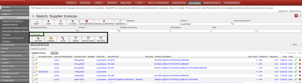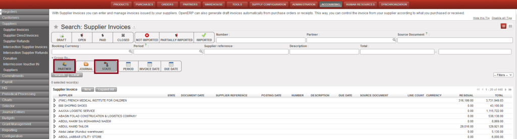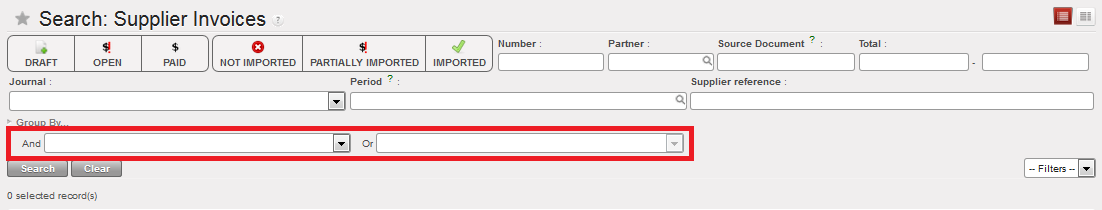 - Selecting multiple buttons groups the next level of records within your initial grouping. In the example below, supplier invoices are first grouped by Partner then by State {Draft}, {Open}, {Closed} within each Partner.