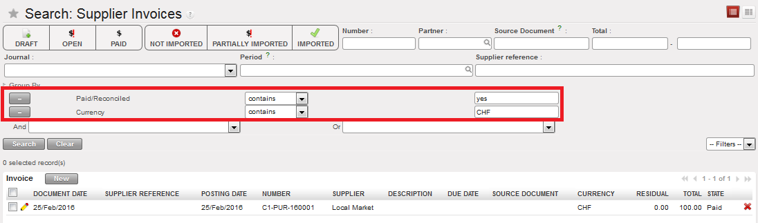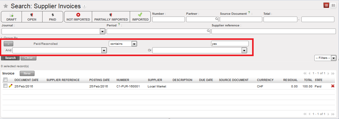 - And in the final field, enter the value which you would like the system to use to perform the search. In the example above, the system will search for all reconciled supply invoices for which the {Paid/Reconciled} field contains “yes”.
