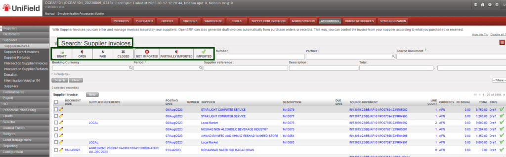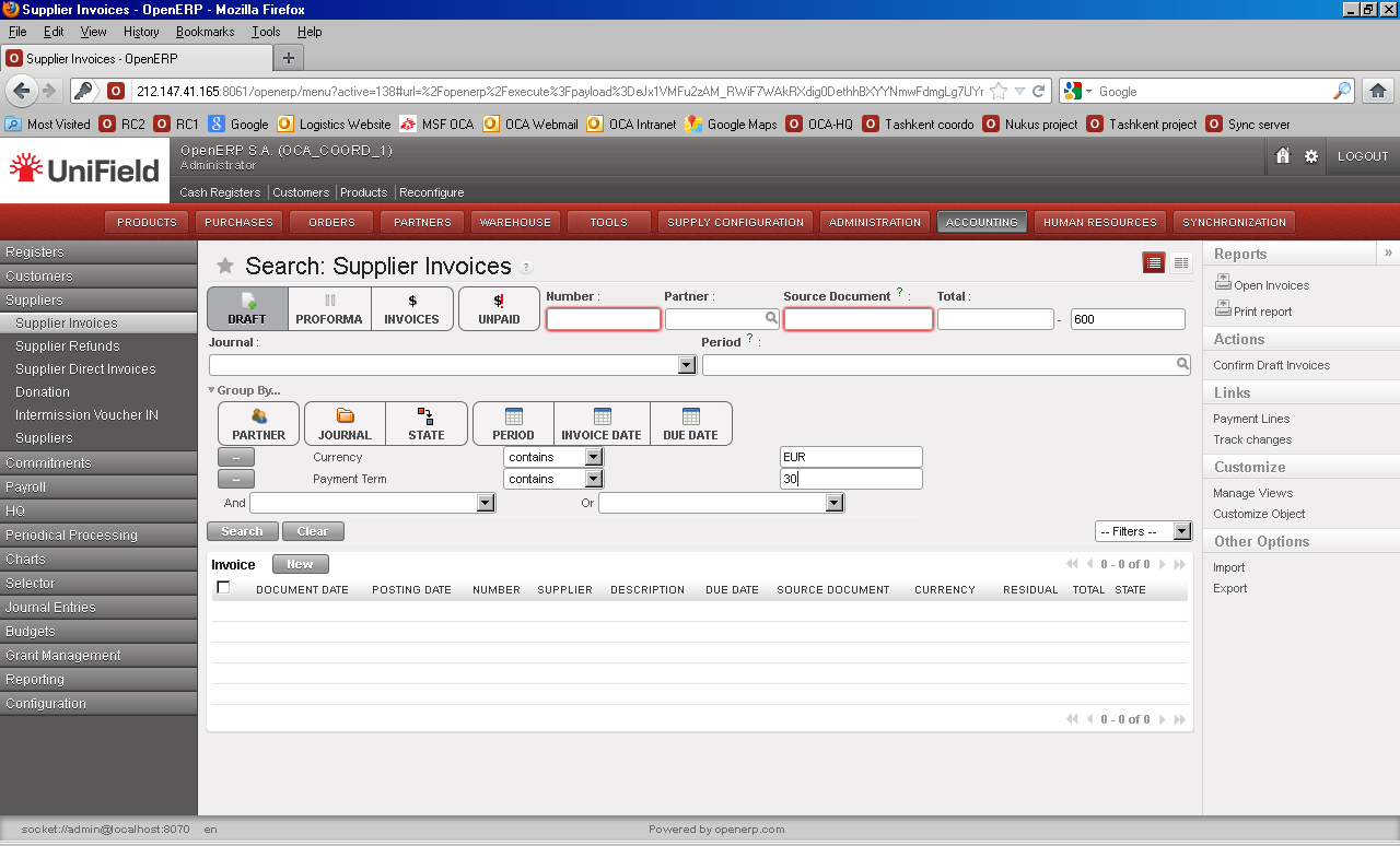 In all search views, there are default search fields which provide a quick way to search. Because UniField has the capacity to search for free text, you can enter any text into a search field. By entering a few characters, the system will display a list to choose from as can be seen in the next figure. To search the database, the user can also use the magnifying glass to get a full list of options available.