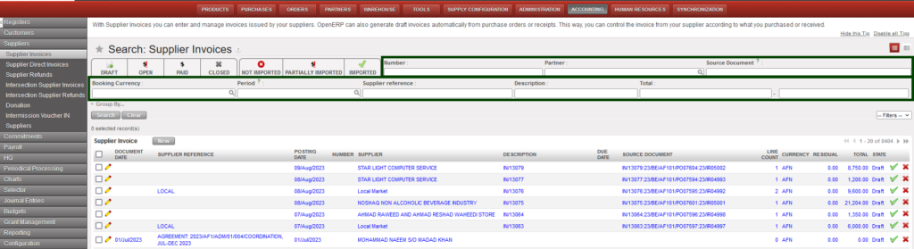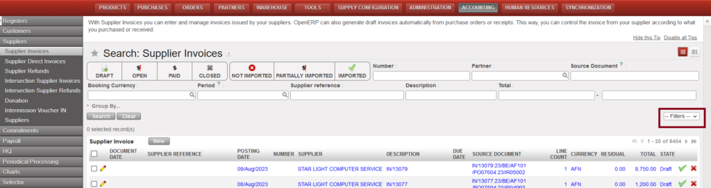 When active, filter buttons turn dark grey; click again to deselect. The system’s searching options are based on “And”, not “Or”, so in this example pressing the filter buttons {Draft} and {Paid} will not return any result as an invoice cannot be both Draft and Paid.