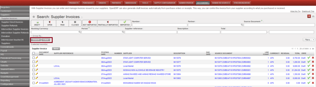 - Subtotals per grouping are displayed where numeric fields are applicable, e.g. Residual and Total for Supplier Invoices.