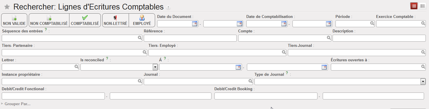 | Fonctionnel Débit/Crédit | Sélectionne les lignes d’écriture comptables par montant en devise fonctionnelle. |