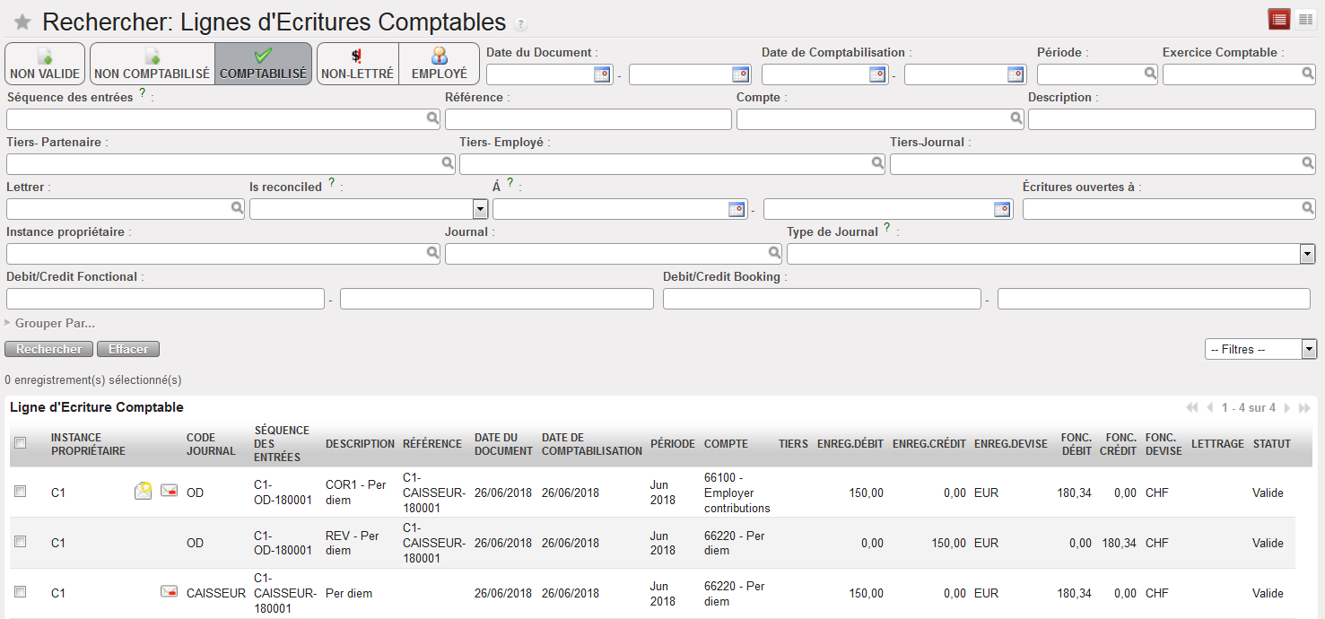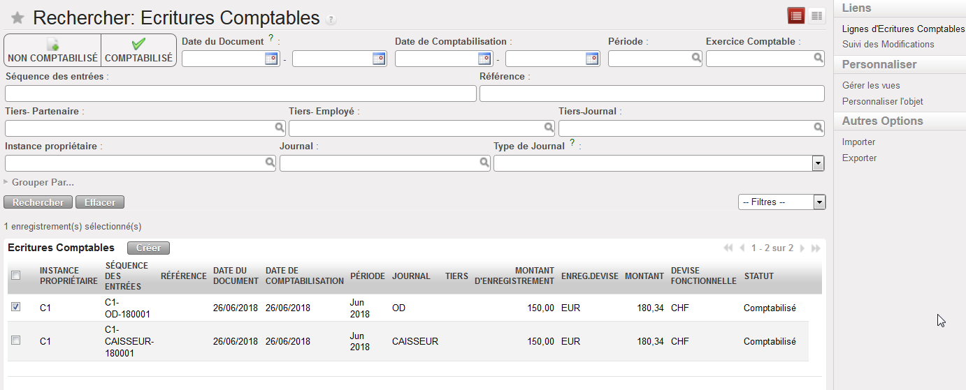 Lignes d’écriture comptables – options de recherche « Comptabilisé » sélectionnée