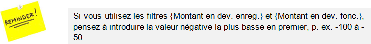 | Montants en devise d’enregistrement et fonctionnelle | Sélectionne les lignes d’écriture analytiques dont le montant correspond à la fourchette choisie. Dans les lignes d’écriture analytiques, les montants de début sont des valeurs négatives. Pour rechercher une fourchette de montants négatifs, pensez à introduire la valeur négative la plus importante en premier, p. ex. -100 à -50. |
