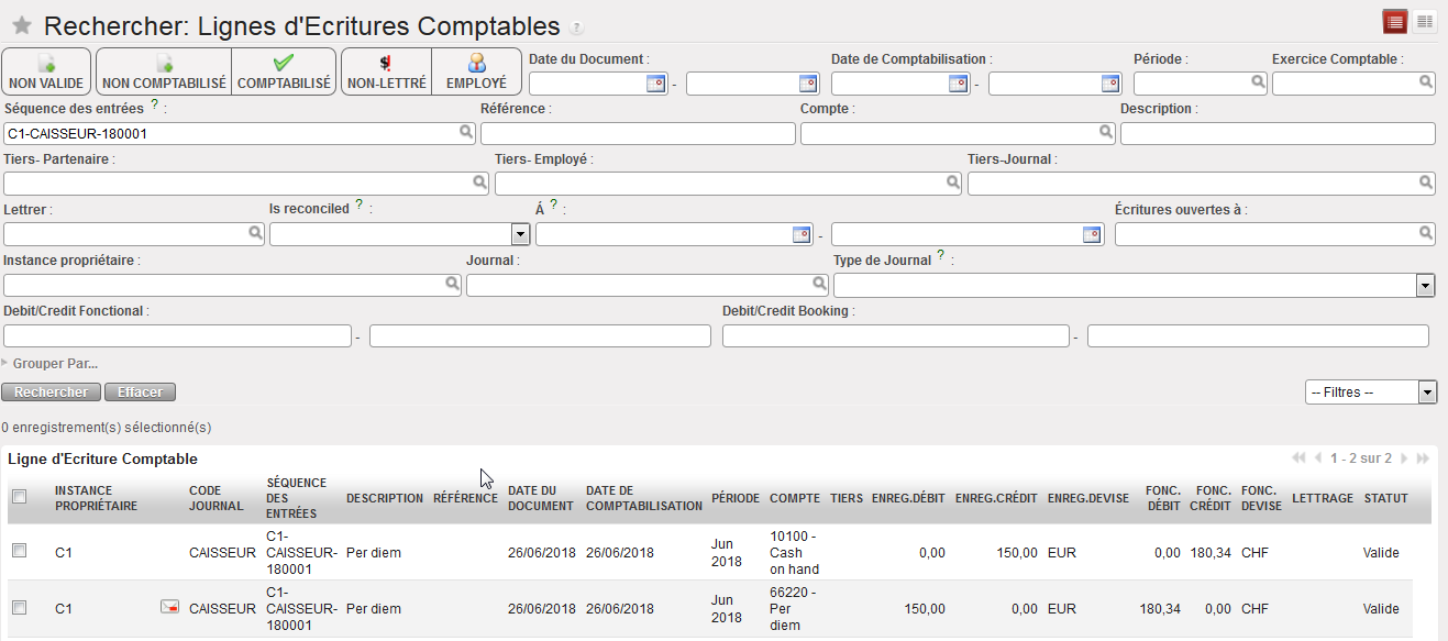 Lorsque les Lignes d’écriture comptables sont ouvertes en vue Recherche, le bouton de filtrage {Comptabilisé} est activé par défaut : seules les entrées comptabilisées s’affichent. Vous constaterez que chaque entrée s’affiche en devise d’enregistrement et en devise fonctionnelle.