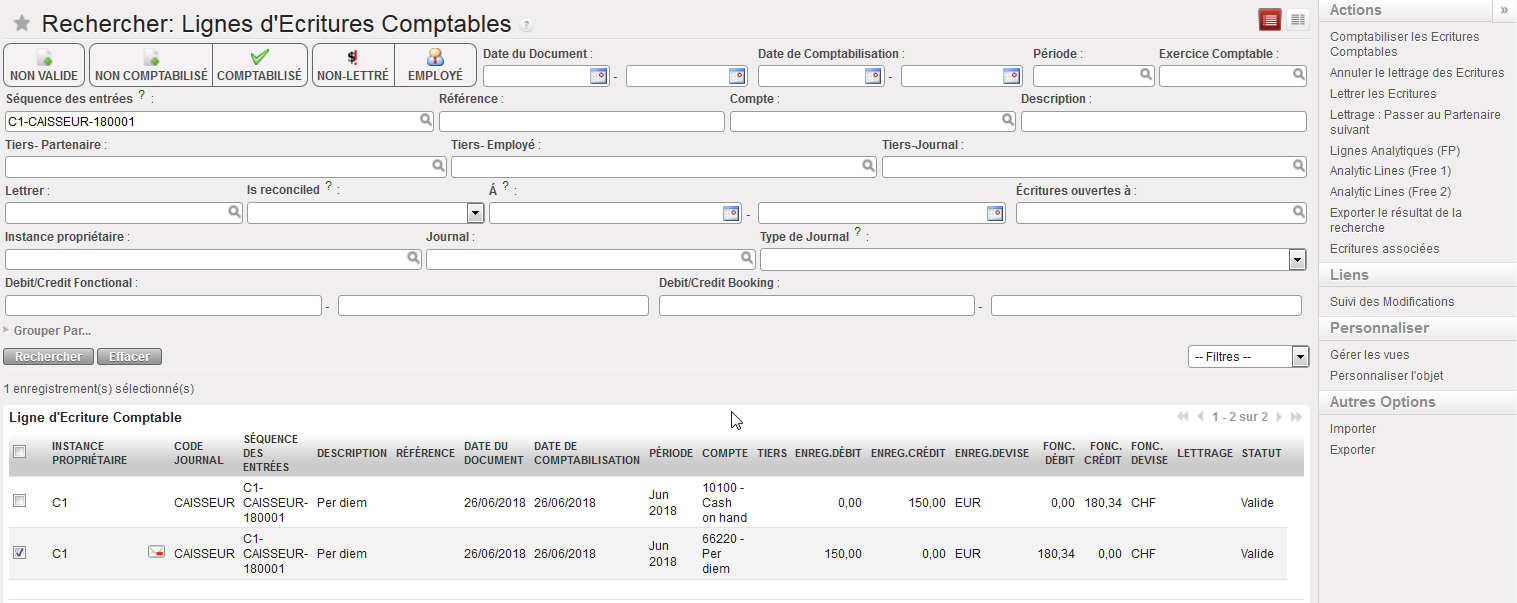 Lignes d’écriture comptables – options de recherche « Comptabilisé » sélectionnée