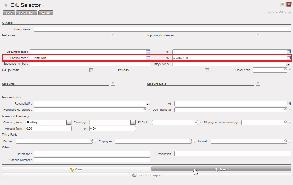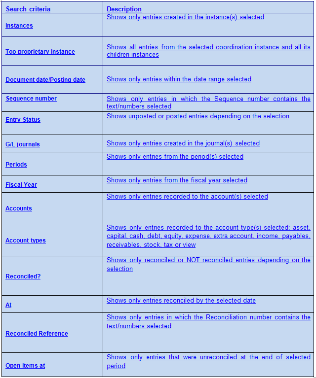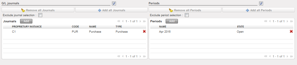 You have a wide range of possibilities to search for data in the G/L selector. Ticking the checkbox for a selected heading will expand the screen for the user to select specific criteria (e.g. periods, proprietary instances, accounts). Similar to default search fields in other modules, you can enter data manually or use the magnifying glass to select from a drop-down list.