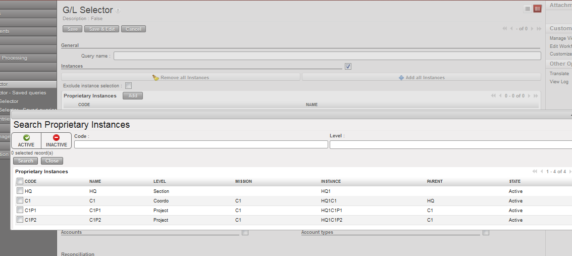 Ticking the Instances checkbox in the G/L Selector expands the view to select criteria for Instances