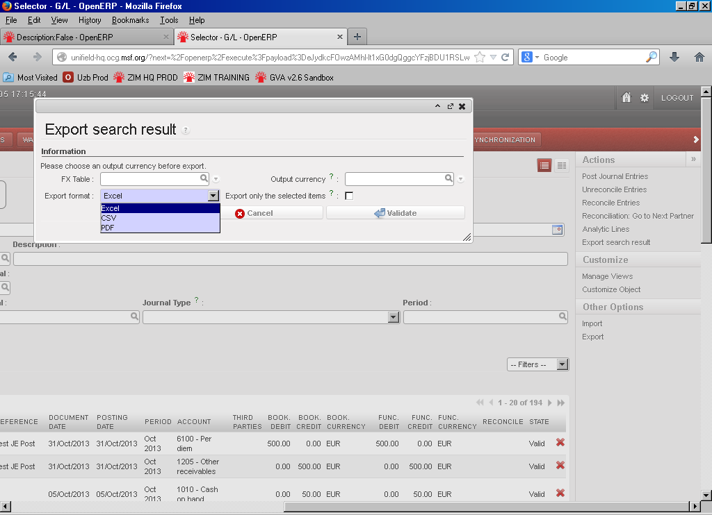 A new window will display with additional export options to select if desired, e.g. currency, format. Click {Validate}.