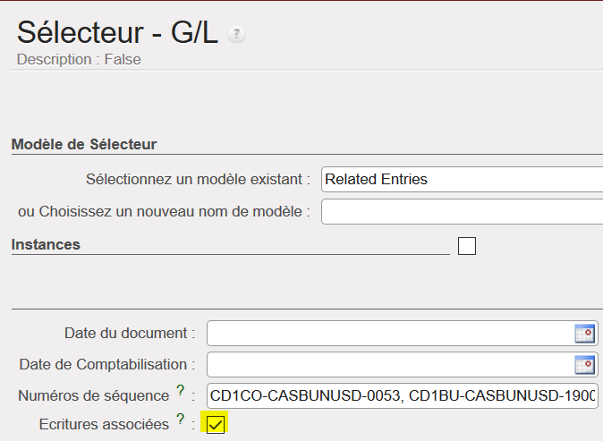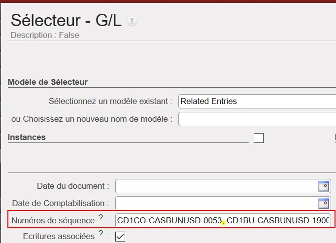 Lorsque vous effectuez une requête dans le sélecteur G/L et le sélecteur analytique, dans le champ «Numéros de séquence», il est possible de définir plusieurs séquences en les séparant par une «virgule».