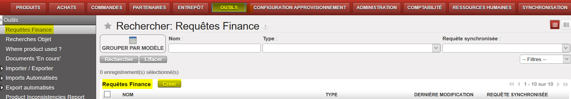 - Allez à OUTILS/Outils/Requêtes Finance/Créer