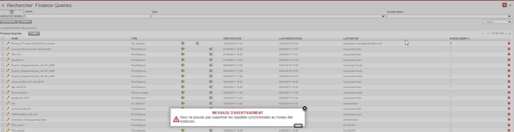 La requête sera synchronisée avec toutes les instances inférieures et sera visible directement dans le sous-menu correspondant. On n’est peut pas supprimer des requêtes synchronisées. On aura un message d’erreur dans le cas où l’on essaye de le faire: “Vous ne pouvez pas supprimer les requêtes synchronisées au niveau des instances”.