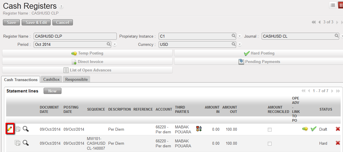 - Click on the pencil to correct account code or the AD icon to correct analytic distribution