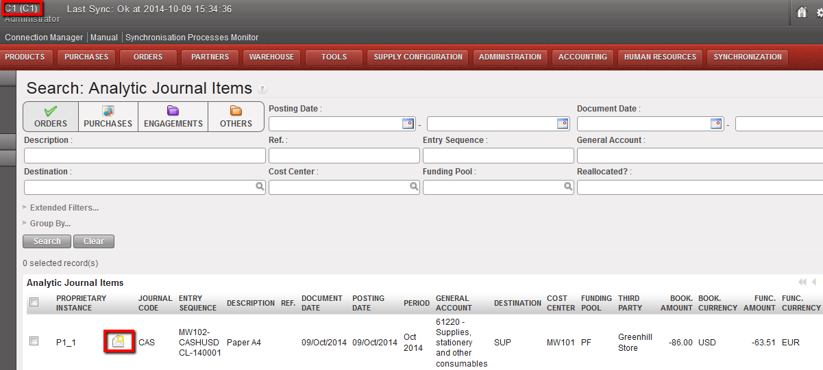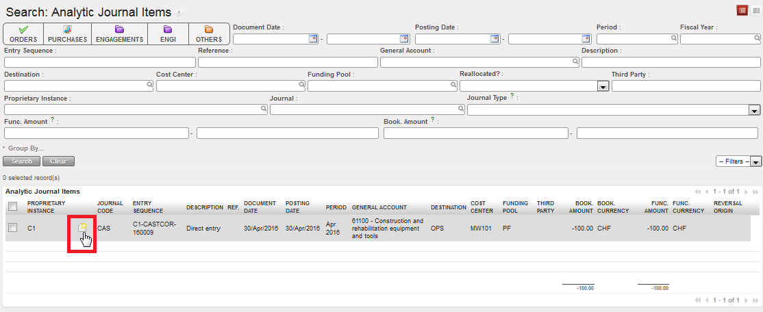- The entries associated with this correction can also be searched directly in Analytic Journal Items. The original entry and the correction entry both display the icon to show the corrections history. The envelope icon is no longer displayed next to the original expense entry in Journal Items since a correction has been made. The envelope icon is now next to the corrected entry and is to be used if user needs to correct the corrected entry.
