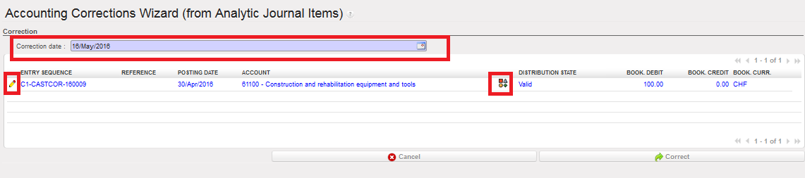 - The {Accounting Corrections Wizard} opens. Enter the date on which the correction was made. To make a correction to account code, click on the pencil